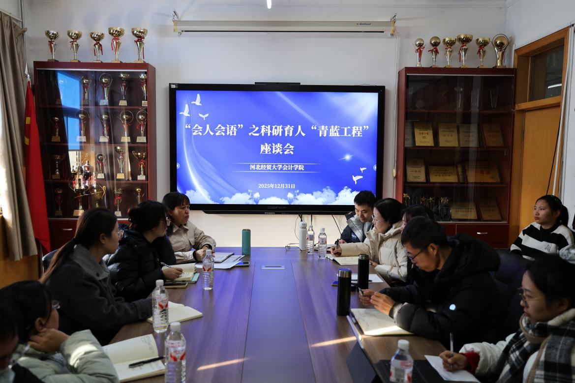 12月31日上午,河北经贸大学会计学院于第四办公楼308会议室举办2025年度“会人会语”之科研育人“青蓝工程”总结座谈会。会计学院党委书记王继伟、院长李西文、党委副书记张强、副院长邸丛枝、刘海云出席,全院青年教师参加。